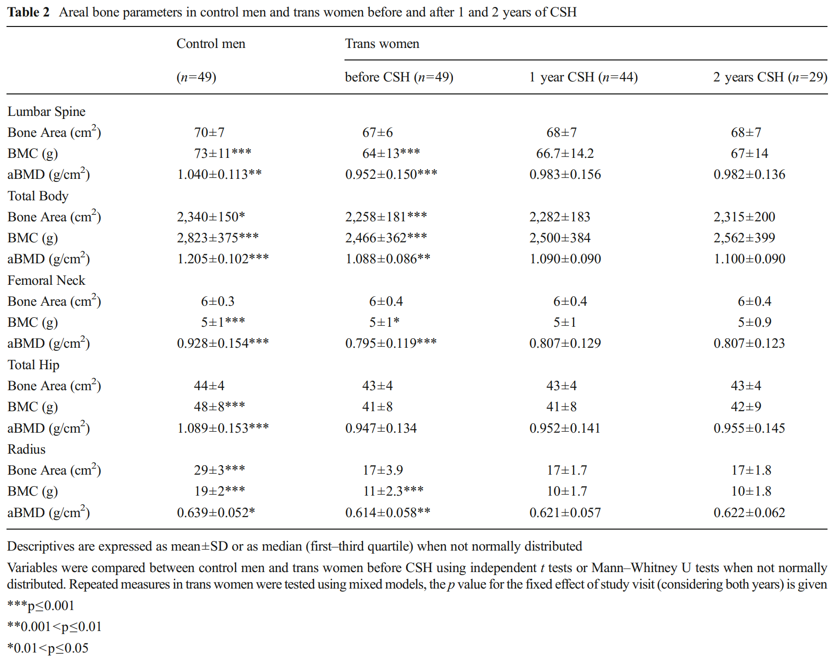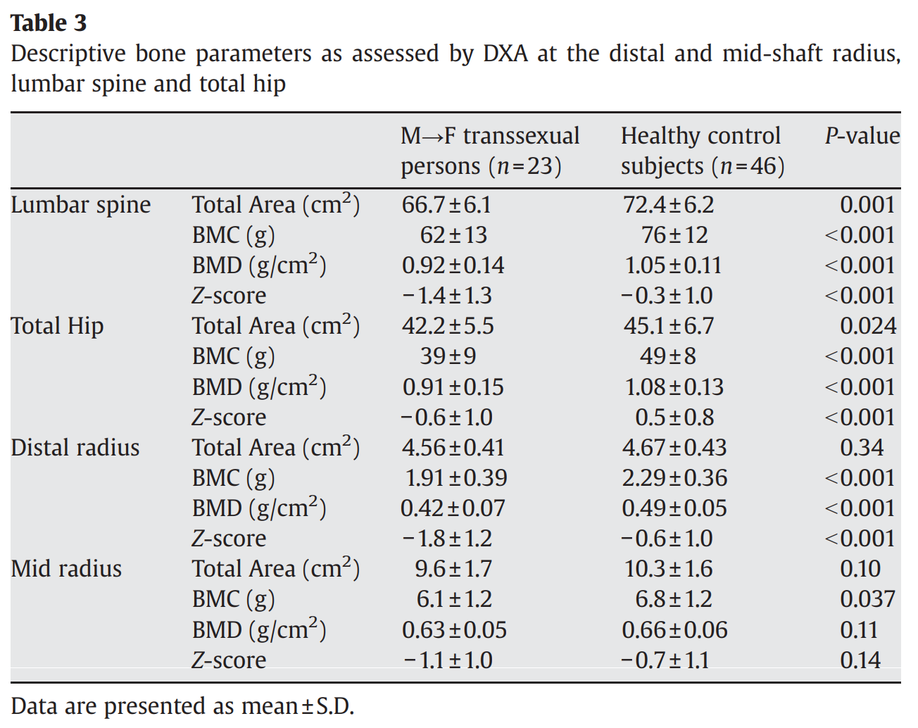 - Van Caenegem, E., Wierckx, K., Taes, Y., Schreiner, T., Vandewalle, S., Toye, K., Kaufman, J., & T’Sjoen, G. (2014). Preservation of volumetric bone density and geometry in trans women during cross-sex hormonal therapy: a prospective observational study. Osteoporosis International, 26(1), 35–47. [DOI:10.1007/s00198-014-2805-3]