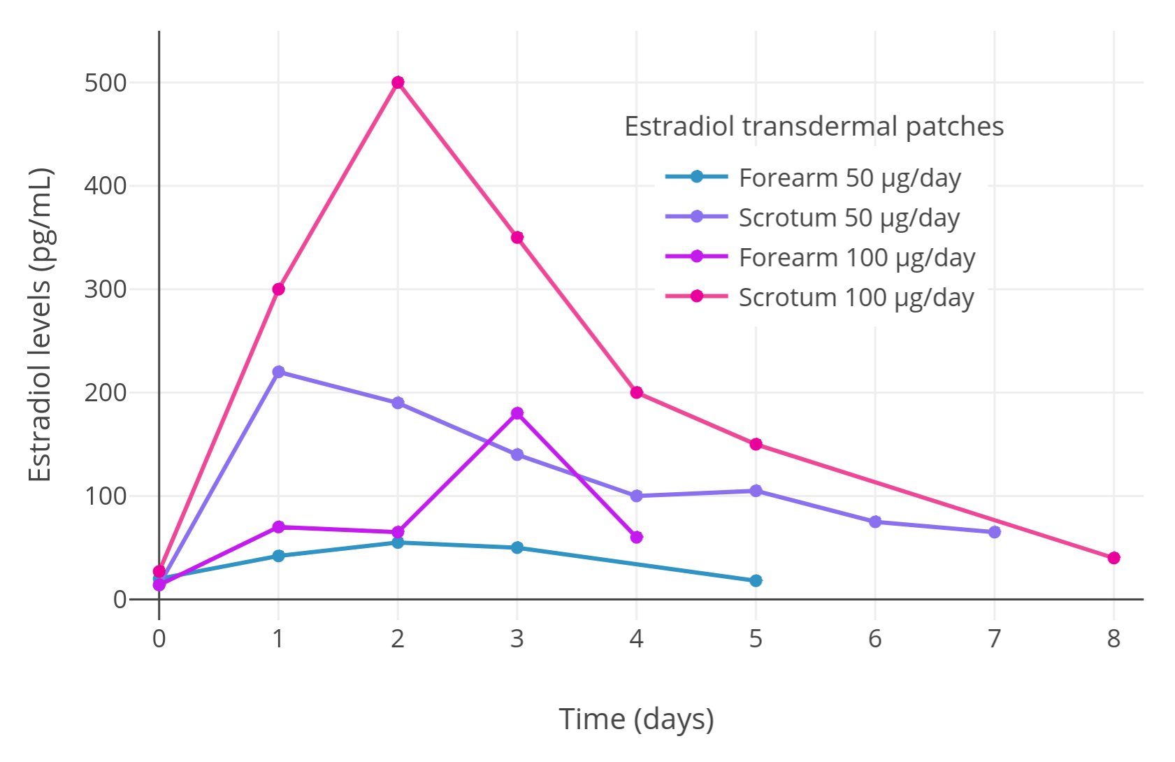 First, Premoli et al. (2005) conducted a crossover proof-of-concept pilot experiment with two men with prostate cancer to assess whether scrotal transdermal estradiol is absorbed better than non-scrotal transdermal estradiol. One of the men used a 50 μg/day transdermal estradiol patch on the forearm first and subsequently on the scrotum, while the other man used a 100 μg/day transdermal estradiol patch on the forearm initially and then on the scrotum. The researchers found that maximal estradiol levels were much higher with scrotal application compared to application to the forearm: