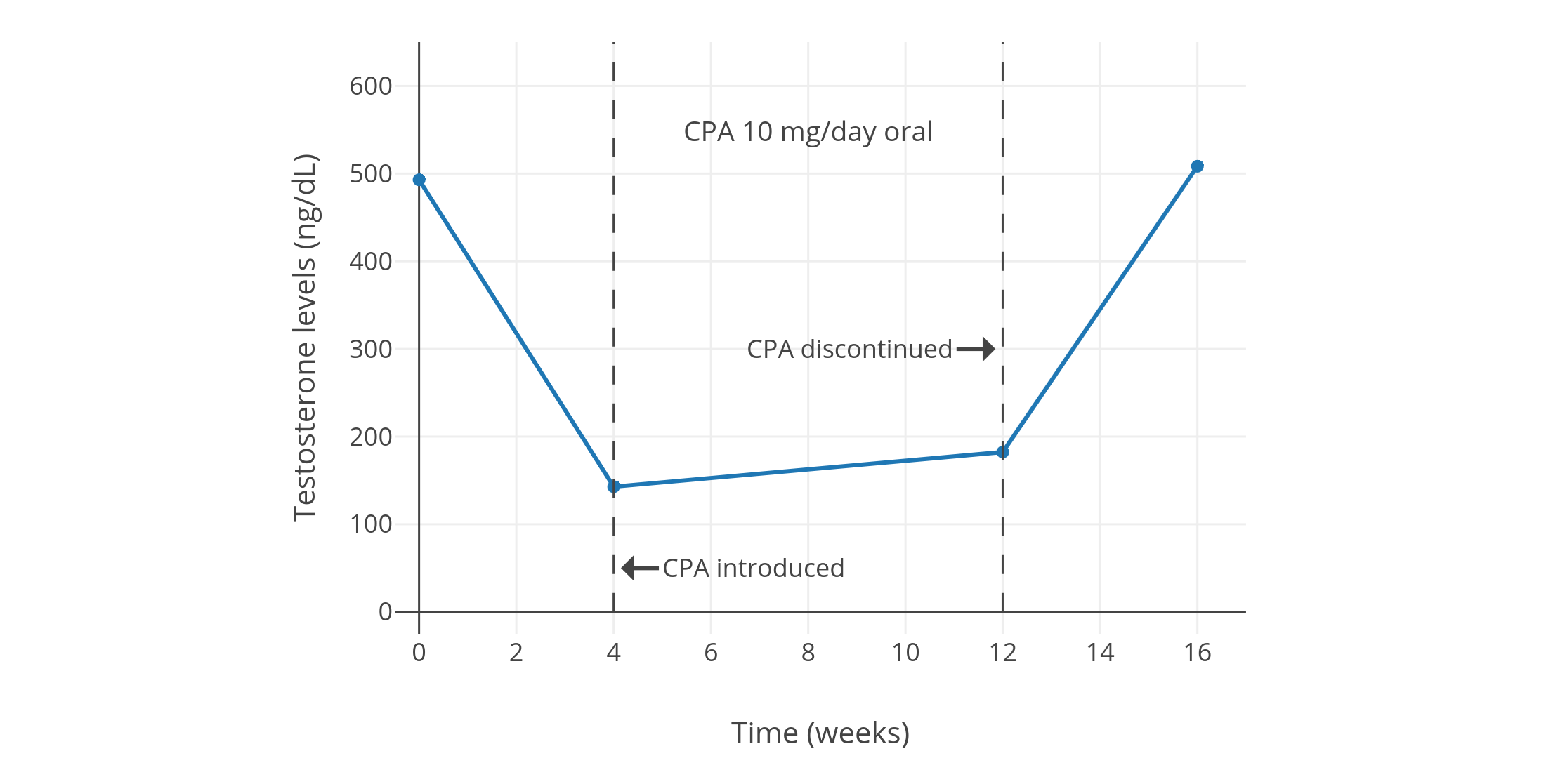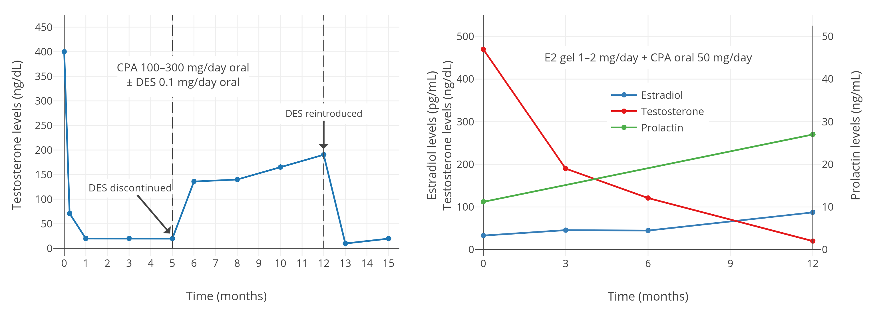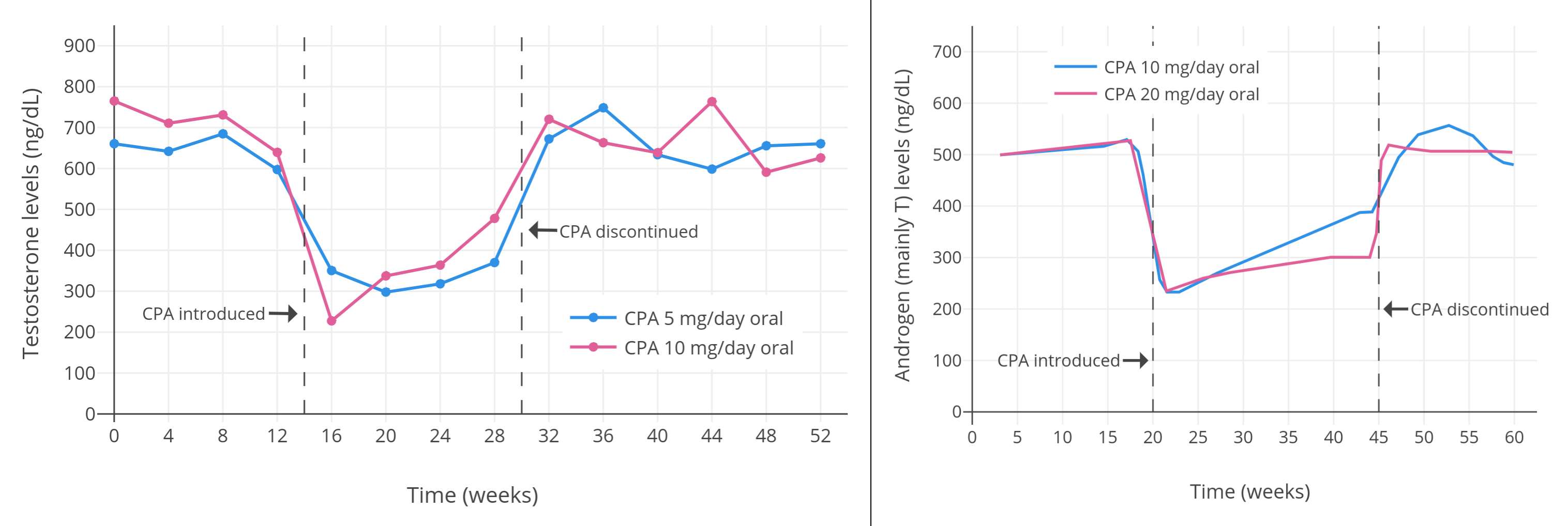 The combination of estradiol and high doses of CPA (e.g., 50–100 mg/day) in transfeminine people has been shown to suppress testosterone levels into the normal female range (≤50 ng/dL or ≤1.7 nmol/L) in numerous studies (Giltay & Gooren, 2000; Giltay et al., 2000; Giltay et al., 2003; Giltay et al., 2004; Toorians et al., 2003; T’Sjoen et al., 2005; Slagter et al., 2006; T’Sjoen et al., 2009; Ott et al., 2011; Wierckx et al., 2012; Wierckx et al., 2014; Zubiaurre-Elorza et al., 2014; Fuss et al., 2015; Van Caenegem et al., 2015; Gava et al., 2016; Bultynck et al., 2017; Fung, Hellstern-Layefsky, & Lega, 2017; Kranz et al., 2017; Tack et al., 2017; Wiepjes et al., 2017; de Blok et al., 2018; Defreyne et al., 2018; Vita et al., 2018; Angus et al., 2019; Chen et al., 2019; Scharff et al., 2019; van Dijk et al., 2019; van Velzen et al., 2019; Vereecke, 2019; Vlot et al., 2019; Wiepjes et al., 2019; Kranz, Kaufmann, & Lanzenberger, 2020; Meyer et al., 2020; Gava et al., 2020; Sofer et al., 2020; Vereecke et al., 2021).