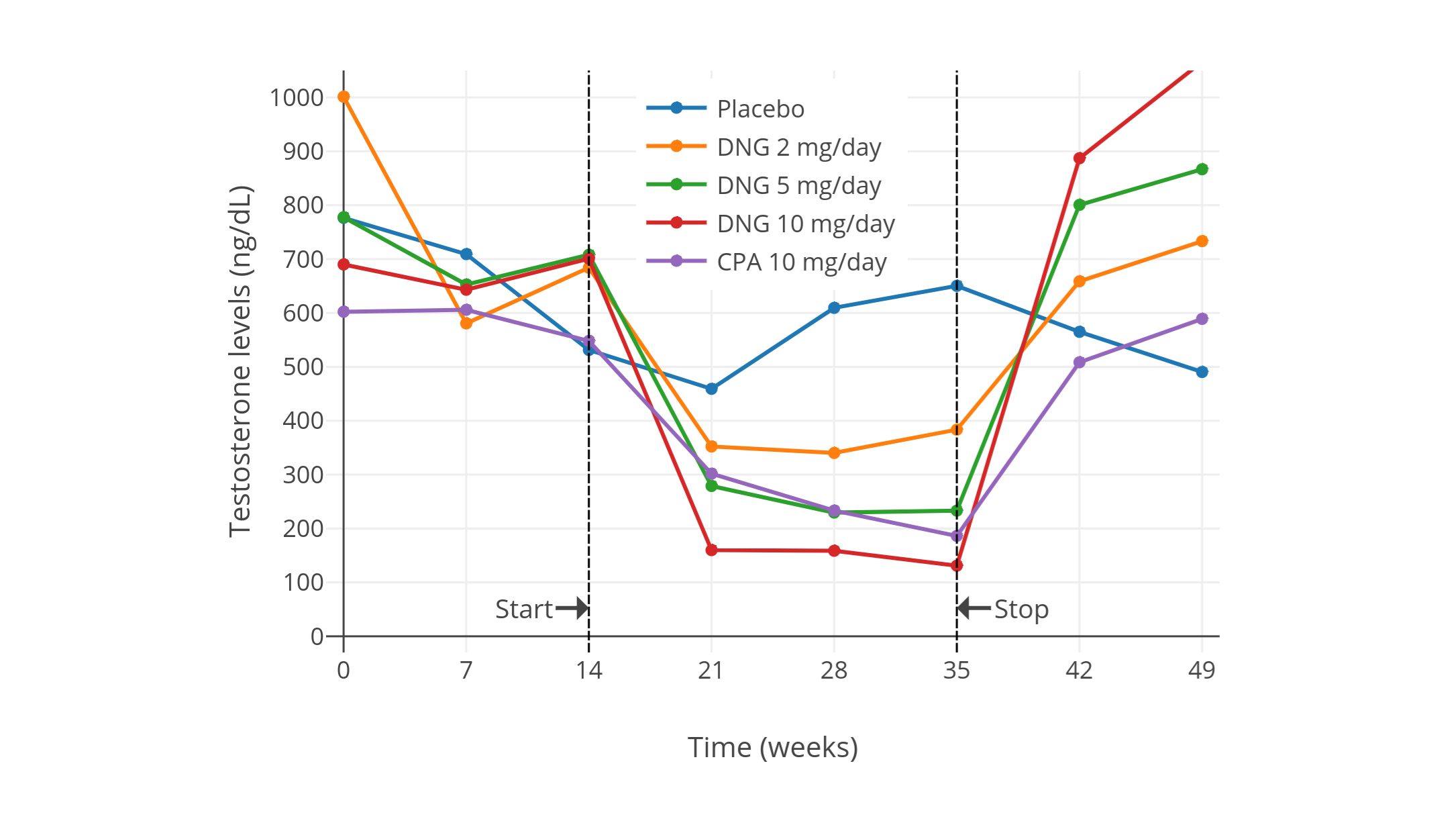 | Figures 1–4: Testosterone levels during treatment with low doses of CPA alone in men. Sources: Top: Moltz et al. (1980); Moltz et al. (1978a); Moltz et al. (1978b). Mid-left: Wang & Yeung (1980). Mid-right: Koch et al. (1976); Koch et al. (1975). Bottom: Meriggiola et al. (2002a). See also on Wikipedia: Gallery. The bottom graph is the 2002 study using DELFIA to quantify testosterone levels. This study also assessed different doses of dienogest (DNG), which has an ovulation-inhibiting dose of 1 mg/day similarly to CPA. |