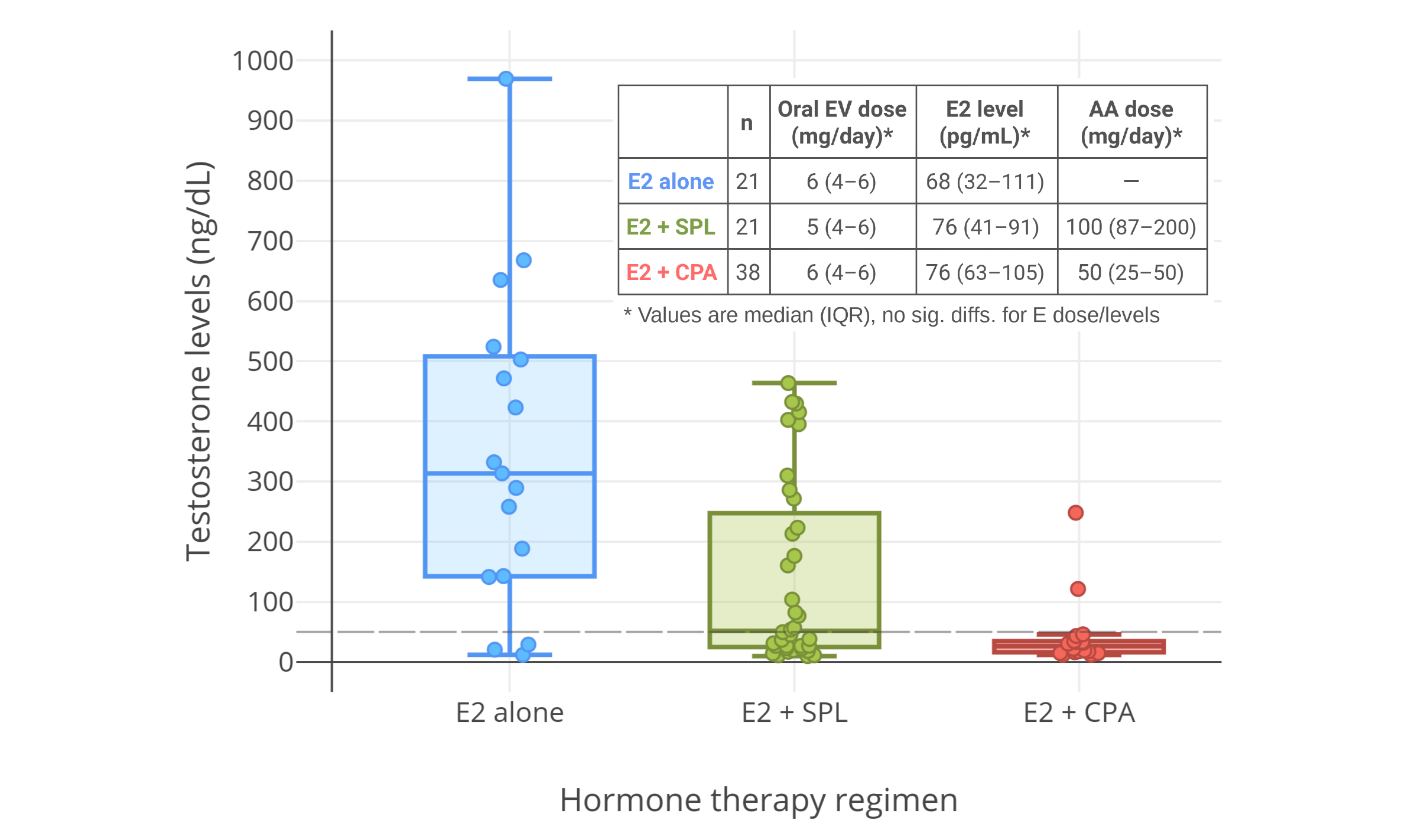Accordingly, Meyer et al. (2020) assessed a dosage of CPA in combination with estradiol in 155 transfeminine people and found no difference in testosterone levels with 10, 25, or 50 mg/day CPA; testosterone levels were strongly suppressed with all three doses (to about 15–20 ng/dL on average, or into the lower end of the normal female range). The estradiol forms and doses used in this study were oral estradiol valerate (median 6 mg/day, range 3–10 mg/day), transdermal estradiol gel (median 2.25 mg/day, range 1.5–6 mg/day), and transdermal estradiol patches (100 μg/day in all cases). Estradiol levels were about 100 pg/mL on average, with an interquartile range (i.e., difference between 75th and 25th percentiles) of about 100 pg/mL. This study demonstrates that, provided estradiol levels are adequate, no more than 10 mg/day CPA is needed to fully suppress testosterone levels in transfeminine people. Another study likewise found no difference between <20 mg/day and >50 mg/day CPA in terms of testosterone suppression in transfeminine people (Even-Zohar et al., 2020).